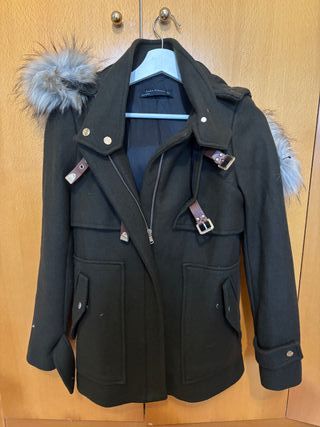 Abrigo de la marca Zara en color verde militar. Un diseño moderno y funcional. - Detalle de pelo en la capucha. - Cierre cruzado con cremallera. - Hebillas decorativas en los laterales. - Bolsillos frontales con solapa.