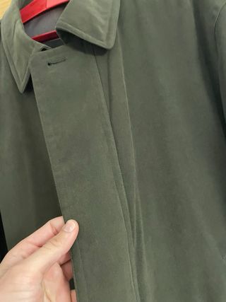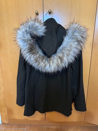 Abrigo de serraje con un llamativo cuello de pelo, sin estrenar. - Diseño moderno y elegante. - Acabado en serraje. - Detalle de pelo en cuello y solapas.
