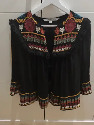 Preciosa chaqueta, estilo blusa. Abierta por delante, cierre con cordón. - Bordados por la parte delantera, trasera y a lo largo de la manga. - Detalle de flecos en los hombros. - Cierre con lazada. - Manga francesa. En su día fue una prenda muy buscada, su precio original es de 50 eur.