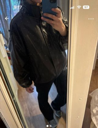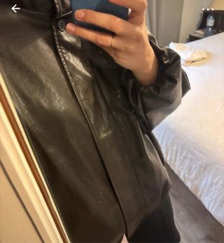 Cazadora de piel negro de Zara con un diseño moderno y atrevido. - Cuello con tachuelas plateadas. - Cierre de cremallera. - Bolsillos con cremallera. - Cinturón con hebilla.