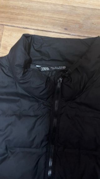 Chaqueta acolchada de Zara con acabado brillante. - Diseño moderno y llamativo. - Capucha integrada. - Cierre de cremallera y botones. - Bolsillos laterales. Es de chico pero lo compré para mí . Mando fotos con el puesto si necesario.