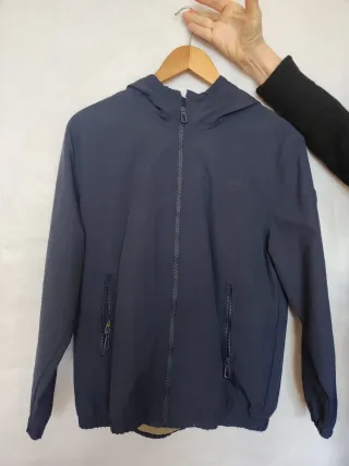 Chaqueta de entretiempo para niño en color azul marino. - Talla 13-14 - Poco uso. - Diseño bicolor. - Capucha. - Cremallera frontal. - Bolsillos con cremallera.