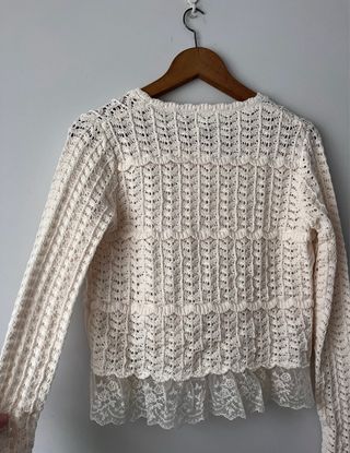 Chaqueta de punto fina con detalles de encaje. - Diseño calado. - Volantes decorativos. - Cierre de botones. - Bajo con encaje.