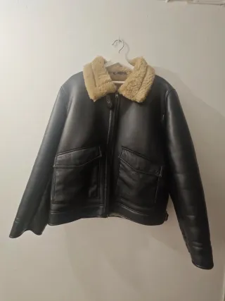 Chaqueta de cuero para hombre con cuello e interior de borrego. Es oversize (como una XL). Edición limitada de hace 1 año. Sin etiquetas, nunca se ha usado. Cierre de cremallera. Dos bolsillos delanteros con solapa.