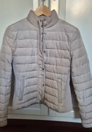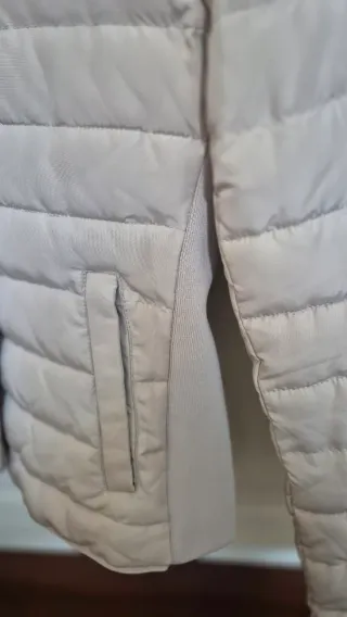 Chaqueta acolchada de color beige, ideal para el entretiempo. Presenta un diseño moderno y funcional. Talla S de zara aunque puede dar más talla por las gomas laterales. - Cierre de cremallera. - Cuello alto. - Bolsillos laterales. - Entallada - Ajustable con gomas laterales.
