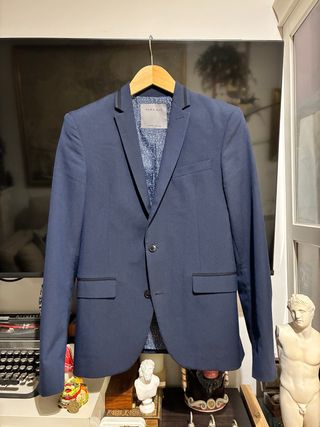 Conjunto de traje de chaqueta y pantalón de Zara. - Chaqueta de un botón. - Pantalón con pinzas. - Detalles de pespunte blanco.