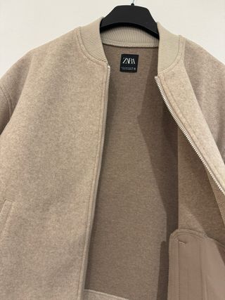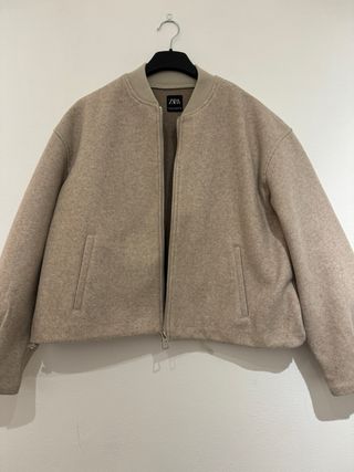 Chaqueta Zara Basic de color beige, con un diseño entallado y detalles que la hacen única. - Cuello con pelo sintético. - Cierre de cremallera y botones a presión. - Bolsillos frontales. - Puños elásticos.