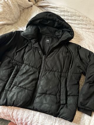 Chaqueta de plumas negra de Zara con capucha. - Cierre de cremallera. - Bolsillos laterales. - Cordones ajustables en la capucha.