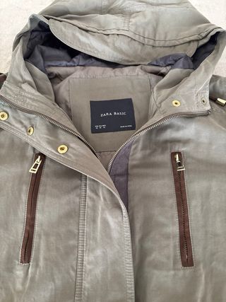 Chaqueta estilo parka de Zara en color verde militar. Es una prenda versátil y con un diseño moderno. - Cierre de cremallera y botones. - Capucha ajustable. - Bolsillos frontales con cremallera. - Cordón ajustable en la cintura.