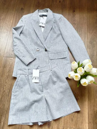 Conjunto de traje de dos piezas de Zara. Chaqueta talla SX pero es muy amplia es perfectamente una talla M. Bermudas talla M - Chaqueta de doble botonadura con solapas de muesca. - Pantalón corto de talle alto con trabillas para cinturón.