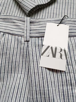 Conjunto de chaqueta y pantalón de Zara con un diseño de raya diplomática. - Chaqueta con solapas clásicas. - Cierre de botones en la chaqueta. - Bolsillos frontales en la chaqueta. - Pantalón de corte recto. - Medidas del pantalón: 40 cm cintura, 110 cm de largo y 55 cm de cadera Usado pero en buen estado