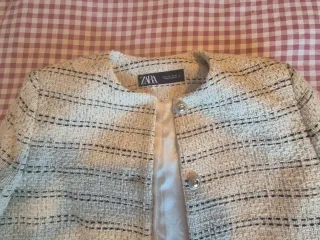 Elegante chaqueta de Zara con un diseño clásico y atemporal. - Patrón de pata de gallo en blanco y negro. - Acabado con flecos y detalles metálicos en los bordes. - Corte estructurado.