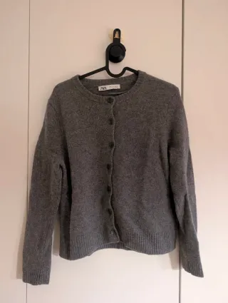 Chaqueta de punto gris de Zara con cuello redondo y botones negros delanteros. Corte basic fit. Talla L (pero talla muy ajustado así que es más bien la M). En buen estado.