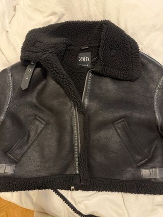 Se vende chaqueta tipo Aviador de marca Zara en color negro forrada en borrego muy calentita, la cremallerasube hasta arriba, talla S, es original, esta como nueva en perfecto estado, apenas ha sido usada
