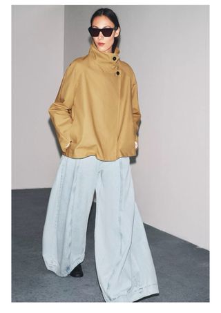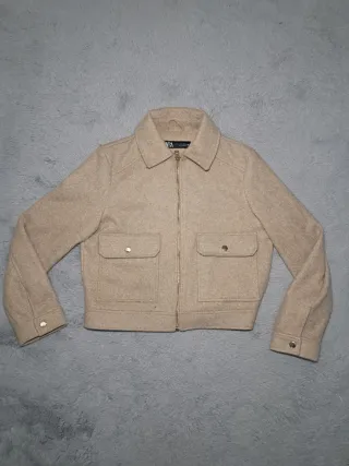 Chaqueta corta de Zara con un diseño moderno y elegante. - Color beige. - Cuello alto. - Cierre cruzado con botones. - Cambio por talla mas grande.