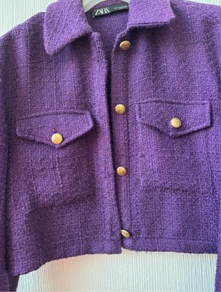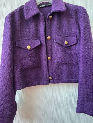 Chaqueta de Zara en color morado. Tiene bolsillos frontales y botones dorados. En perfectas condiciones. - Cierre de botones. - Bolsillos de solapa en el pecho. - Cuello camisero.