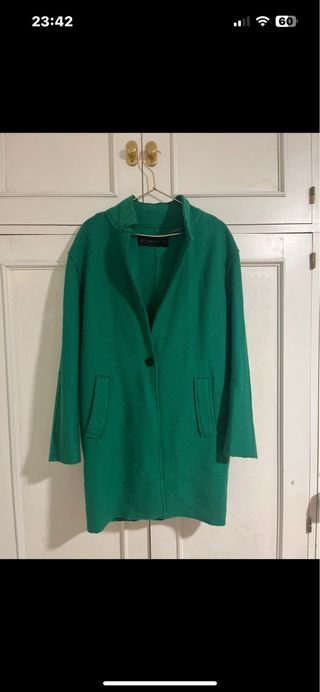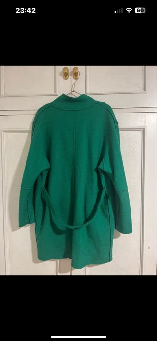 Chaqueta larga de color verde. - Diseño de punto. - Cierre de un botón. - Bolsillos frontales.
