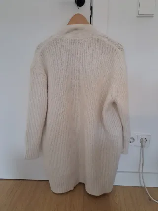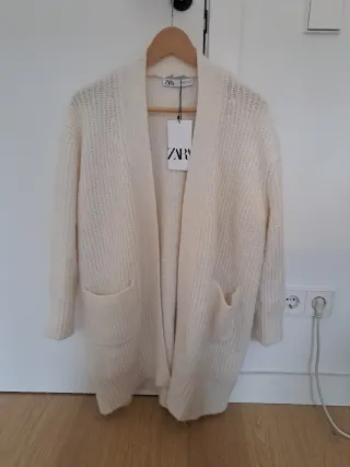 Chaqueta de punto Zara en color beige/blanco. Es una prenda cómoda y versátil. - Diseño abierto. - Dos bolsillos delanteros. - Tejido suave y agradable.
