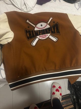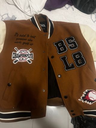 Chaqueta estilo béisbol de Zara para niño. - Diseño con parches y texto CHAMPIONPLYR. - Inscripción It's hard to beat someone who never gives up. - Detalle de BS L8 en la parte delantera. - Mangas color beige y cuerpo marrón.