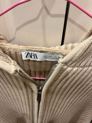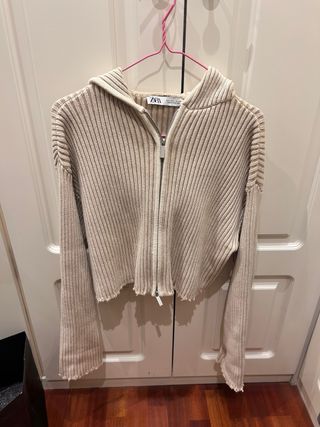 Chaqueta de punto con cremallera y capucha de Zara. - Diseño de canalé. - Bajo y puños deshilachados. Talla L pero da poca talla, sirve para talla M y S.