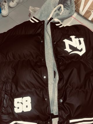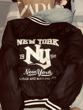Chaqueta estilo bomber de Zara con diseño de New York NY 1958. - Cuello y puños con rayas blancas. - Estampado frontal New York y A Huge and Bustling City. - Cierre de cremallera. Da menos talla