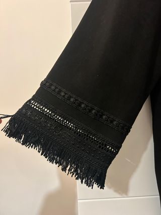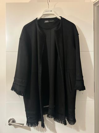 Chaqueta larga de Zara con detalles de flecos. - Diseño con flecos en el bajo de las mangas. - Adorno de pompones y encaje en los puños.