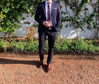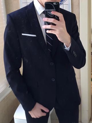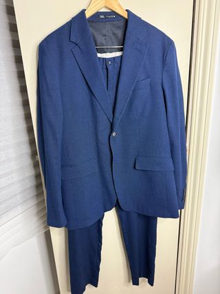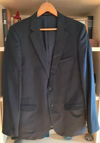 Traje de dos piezas de la marca Zara. - Chaqueta de corte clásico. - Pantalón de vestir. - Color azul marino.