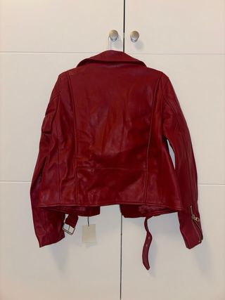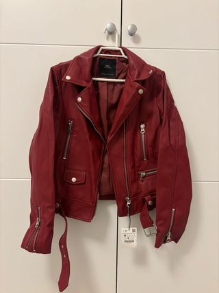 Chaqueta estilo motera de Zara en color rojo. Diseño moderno y atemporal. - Cierre de cremallera frontal. - Bolsillos con cremallera. - Puños con cremallera. - Precio en tienda: 25€