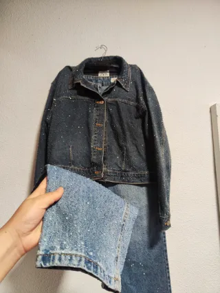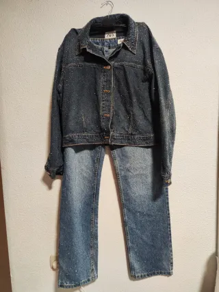 Conjunto de chaqueta y pantalón vaquero con detalles brillantes. - Chaqueta vaquera con botones. - Pantalón vaquero de corte recto. - Tejido con acabado brillante.