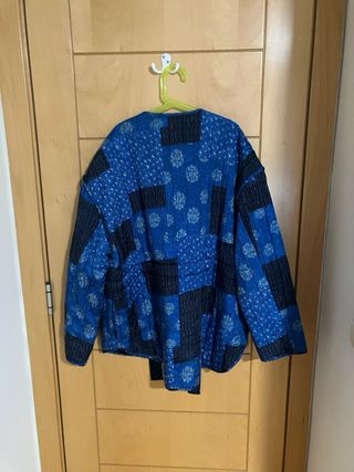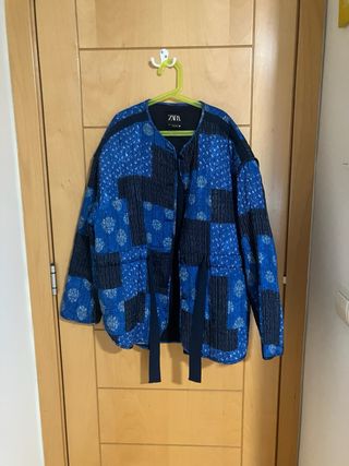 Chaqueta de Zara con un diseño patchwork en tonos azules y negros. Presenta un corte recto y cierre de botones. - Diseño patchwork. - Cuello redondo. - Cierre de botones. - Dos cintas para anudar.