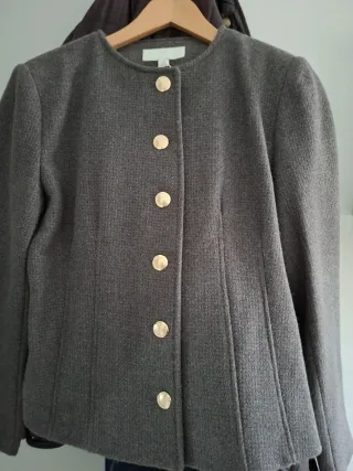 Elegante chaqueta de Zara en color gris. Presenta un diseño clásico con cuello redondo y cierre de botones dorados. - Diseño de corte recto. - Tejido texturizado. - Cierre frontal con cinco botones dorados. - Mangas largas.