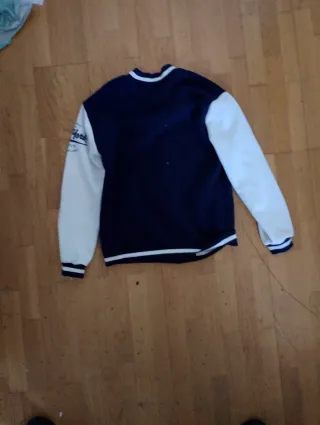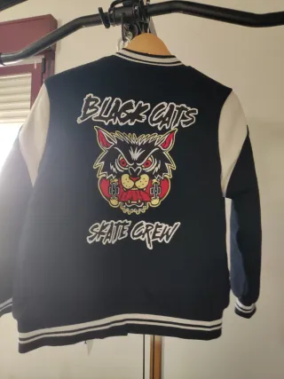 Chaqueta estilo beisbolera con diseño llamativo. Talla 11-12 años - Mangas blancas. - Detalle de bordado de lobo y texto BUICK CATS. - Inscripción TAKE YOUR SURE AND CONQUER THE WORLD TEAM COATS en el pecho. - Puños y bajo con rayas blancas.