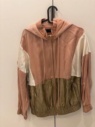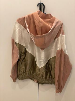 Chaqueta con diseño moderno y detalles llamativos. - Capucha integrada. - Cierre de cremallera frontal. - Mangas largas con puños elásticos. - Cintura elástica. - Paneles de diferentes texturas y acabados. Es bastante fina y da mucha talla soy una M