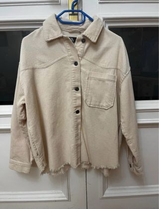 Chaqueta de pana en color beige. - Diseño de corte recto. - Cierre de botones. - Bolsillo en el pecho. - Bajo deshilachado.