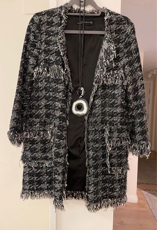 Chaqueta negra de tweed de Zara. Es una prenda elegante y cómoda, ideal para entretiempo. Talla M. Nuevo - Diseño de chaqueta semi larga. - Bolsillos funcionales en la parte delantera. - Detalle de flecos en los bordes. Textil: poliéster - algodón - acrílico