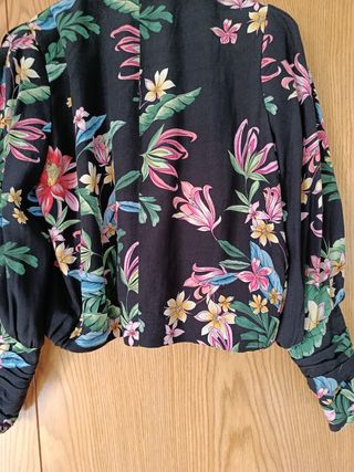 Chaqueta bomber de Zara con un diseño oriental. - Estampado de bambú y nubes. - Mangas y detalles en color rosa pálido. - Cierre de cremallera frontal.