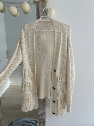 Chaqueta de punto en color crema con un diseño moderno y detalles de flecos. - Tejido de punto con textura. - Adornos de flecos en los bolsillos y parte inferior. - Cierre de botones. - Diseño abierto en la parte delantera.