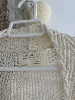 Preciosa chaqueta de punto de Zara, en color beige con detalles en lila y verde claro. Está en perfecto estado, sin usar. - Talla: L - Tejido suave y agradable al tacto - Diseño de punto ligero, ideal para entretiempo - Cierre de botones