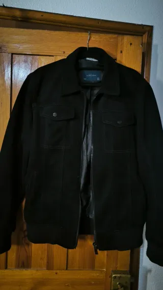 Chaqueta de hombre de Zara en color negro. Diseño moderno y versátil. - Cuello alto con cierre. - Bolsillos frontales con solapa. - Detalle de hombreras. - gorra interior rn cuello " Totalmente nueva solos puesta 2 veces"