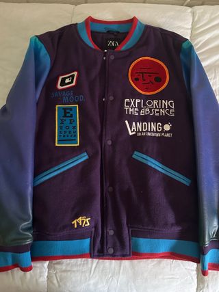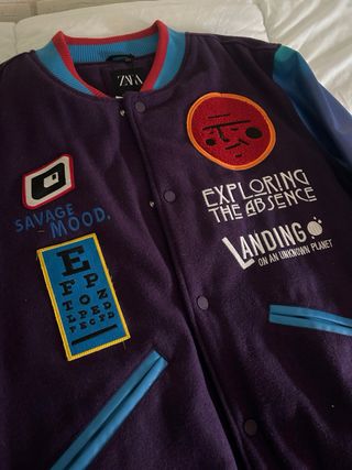 Cazadora bómber con parches de Zara. Varios diseños por toda la prenda y detalles de estampados en ambas mangas. Talla M. Nueva, nunca usada.