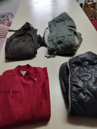 Conjunto de cuatro chaquetas de diferentes marcas. - Chaqueta marrón, reversible - Chaqueta verde con forro interiorde pelito - Chaqueta roja - Chaqueta marrón especie trench de tela de trafaluc