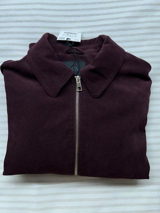 Chaqueta estilo bomber de cuello solapa у manga larga. Bolsillos delanteros de vivo. Bajo acabado en elástico. Cierre frontal con cremallera. Color burdeos