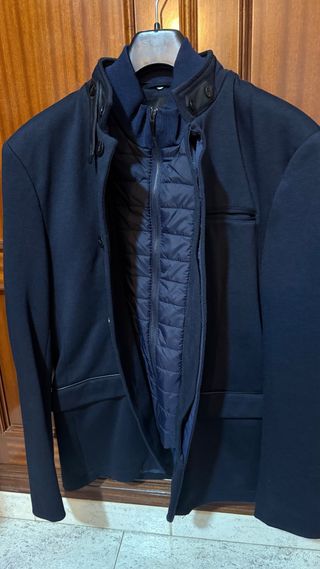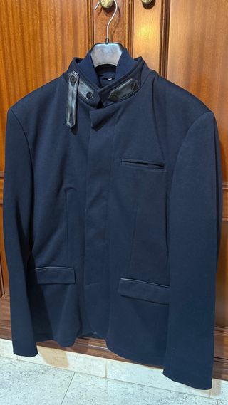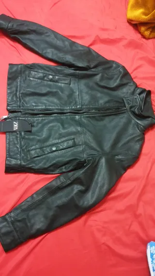 Chaqueta de hombre edición limitada, estilo motera de Zara, confeccionada en una mezcla de lino y algodón. Presenta un diseño moderno y versátil. Con forro y bolsillo interior. Puede ser unisex si te da la manga el largo, o si la arreglas claro. Gran calidad, costó casi 100E. -Abriga gracias a que está forrado con guata por dentro. Materiales orgánicos. - Cierre frontal de cremallera. - Bolsillos con cremallera. Todos útiles. - Cuello solapa con botón a presión. -Detalles de tela con distintas texturas.