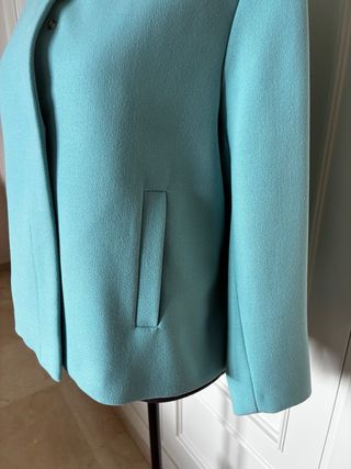 Chaqueta de vestir para mujer en un llamativo color azul turquesa clarito. Diseño elegante y moderno. - Cuello redondo. - Cierre con un discreto broche metálico cuadrado. - Muy elegante. Una puesta
