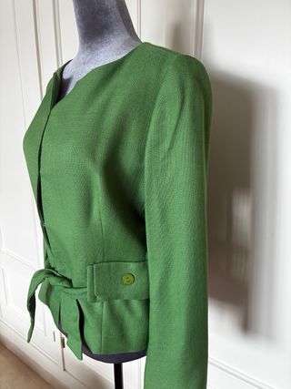 Elegante chaqueta de terciopelo en color verde. Un diseño sofisticado con un toque clásico. - Cierre cruzado con botones. - Botones de perla. - Corte recto. - Incluye cinturón.