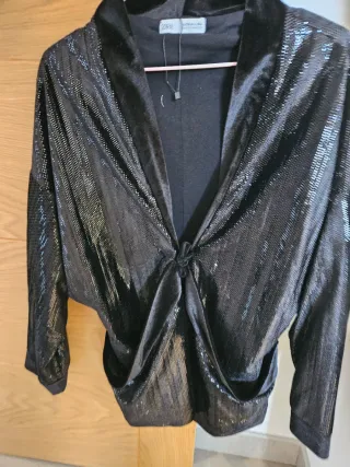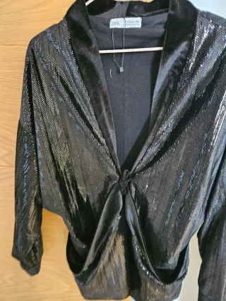 Elegante chaqueta de Zara con un diseño brillante. - Tejido con lentejuelas. - Cierre anudado al frente. - Mangas largas.