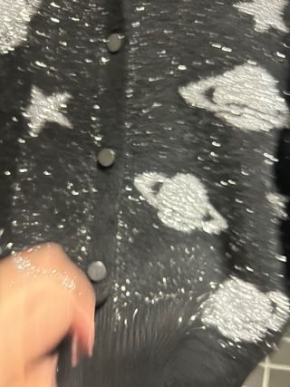 Chaqueta de punto con un diseño espacial único. Ideal para añadir un toque divertido a tu armario. - Estampado de planetas y estrellas. - Tejido con hilo brillante. - Cierre de botones, con dos puestas reales.