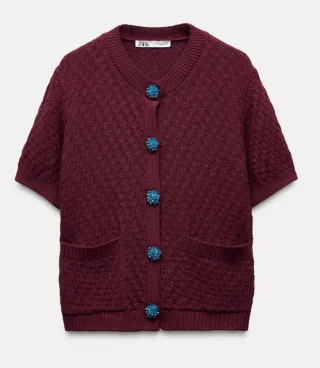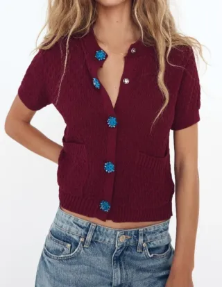 Chaqueta de manga corta, cuello redondo, bolsillos de parche y preciosos botones joya con cierre tipo clip. Punto con textura color burdeos. Talla S. Composición: 50% poliéster y 50% algodón. Está perfecta , sin casi uso.