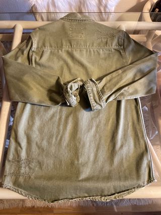 Chaqueta vaquera de Zara con un diseño moderno y desgastado. - Color verde militar. - Detalle de rotos y costuras visibles. - Dos bolsillos en el pecho. - Cierre de botones metálicos.