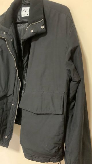 Chaqueta de la marca Zara en color negro y talla M. Un básico versátil para tu armario. - Cuello alto con textura. - Cierre de cremallera. - Bolsillos frontales con solapa. - Puños y bajo ajustables.
